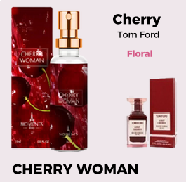 CHERRY WOMAN é uma fragrância ousada e luxuosa, que combina doçura e amargor de forma única. Perfeita para momentos especiais ou para quem gosta de ousar com elegância.
