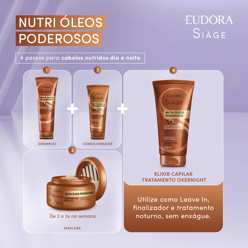 Para isso, a linha Siàge Nutri Óleos Poderosos carrega em sua fórmula inovadora os benefícios de três óleos capilares milenares conhecidos no mundo todo: coco, mirra e amaranto.