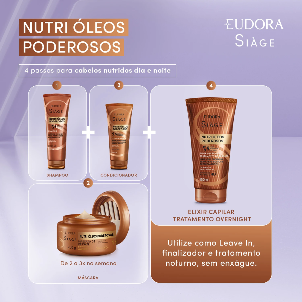 A linha Siàge Nutri Óleos Poderosos é livre de petrolatos, parabenos e sal, além de ter em sua fórmula inovadora o poder do complexo de óleos milenares, que nutre e trata fios rígidos e superelásticos já no 1º dia de uso.
