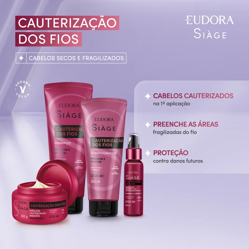 A linha Cauterização dos Fios possui tecnologia de autoaquecimento: ao aplicar o produto e friccionar as mãos, você sentirá um leve aquecimento, isso faz com que os ativos penetrem de forma mais efetiva nos fios além de garantir diversos benefícios. Maior performance!