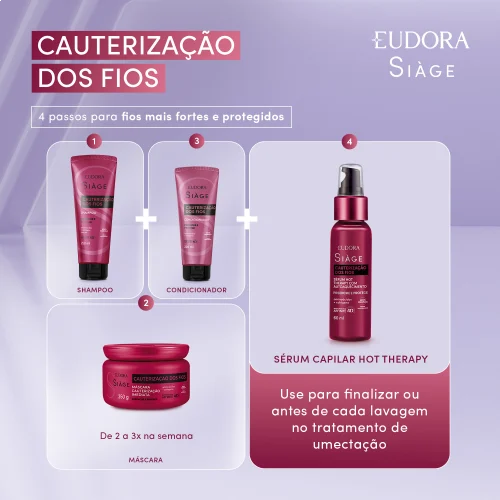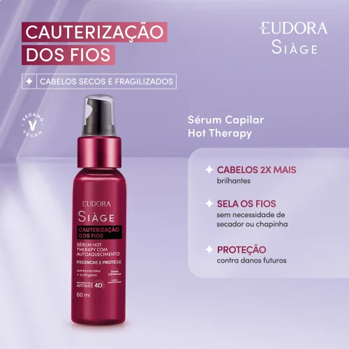 O Sérum Capilar Siàge Hot Therapy Cauterização dos Fios age de maneira gradual, para fios macios, com brilho e hidratados.