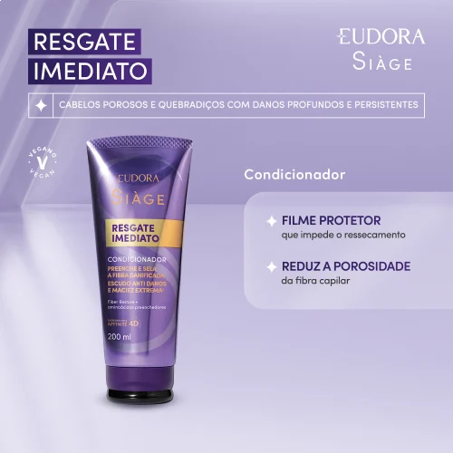 Ideal para uso diário no momento de hair care no banho, o Condicionador Siàge Resgate Imediato vai te auxiliar a resgatar seu cabelo e descobrir novos momentos de autocuidado!